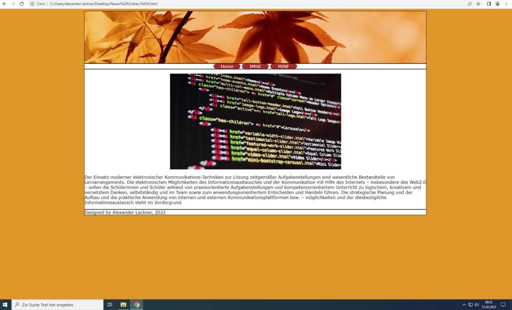 Die Seiten IMSK und MINF enthalten jeweils eine kurze Fachbeschreibung und ein Bild. Dabei haben wir auf die Verwendung von DIV statt Tabellen geachtet, um eine saubere Struktur zu gewährleisten. Außerdem wurde darauf geachtet, webgerechte Bilder zu verwenden und die Dateien unter einem eigenen Namen ohne Leer- oder Sonderzeichen zu speichern.