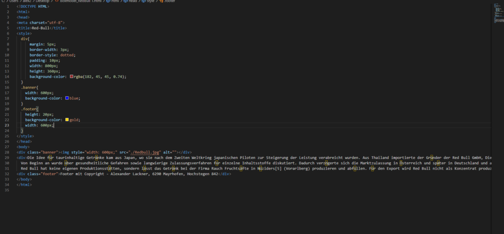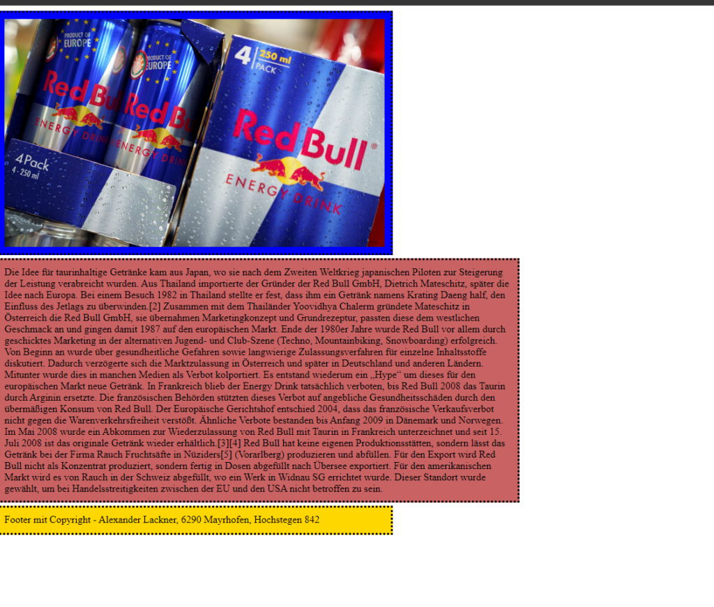 Die Aufgabe war es, eine Webseite zu erstellen, die eine bestimmte Struktur aufweist. Zuerst sollte ein Red Bull Banner als oberstes DIV platziert werden, gefolgt von einer weiteren Box als nächstes DIV. Am Ende der Seite sollte eine Footer-DIV-Box eingebaut werden. Dabei wurde darauf geachtet, den vorhandenen Text zu entfernen und die Seite ausschließlich mit der geforderten Struktur aufzubauen.